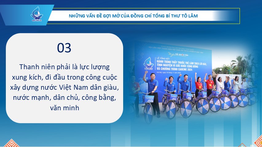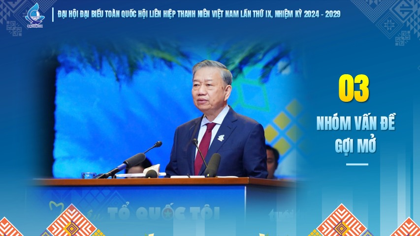 Tại Đại hội đại biểu toàn quốc Hội Liên hiệp Thanh niên Việt Nam lần thứ IX, Tổng Bí thư Tô Lâm đã có bài phát biểu quan trọng, thể hiện sự quan tâm sâu sắc của Đảng, Nhà nước đối với thế hệ trẻ. Bên cạnh việc chỉ ra những nhóm vấn đề cần khắc phục, Tổng Bí thư cũng đã Gợi mở 03 nhóm vẫn đề định hướng cho thanh niên Việt Nam phát triển trong giai đoạn đưa đất nước bước vào kỷ nguyên mới.