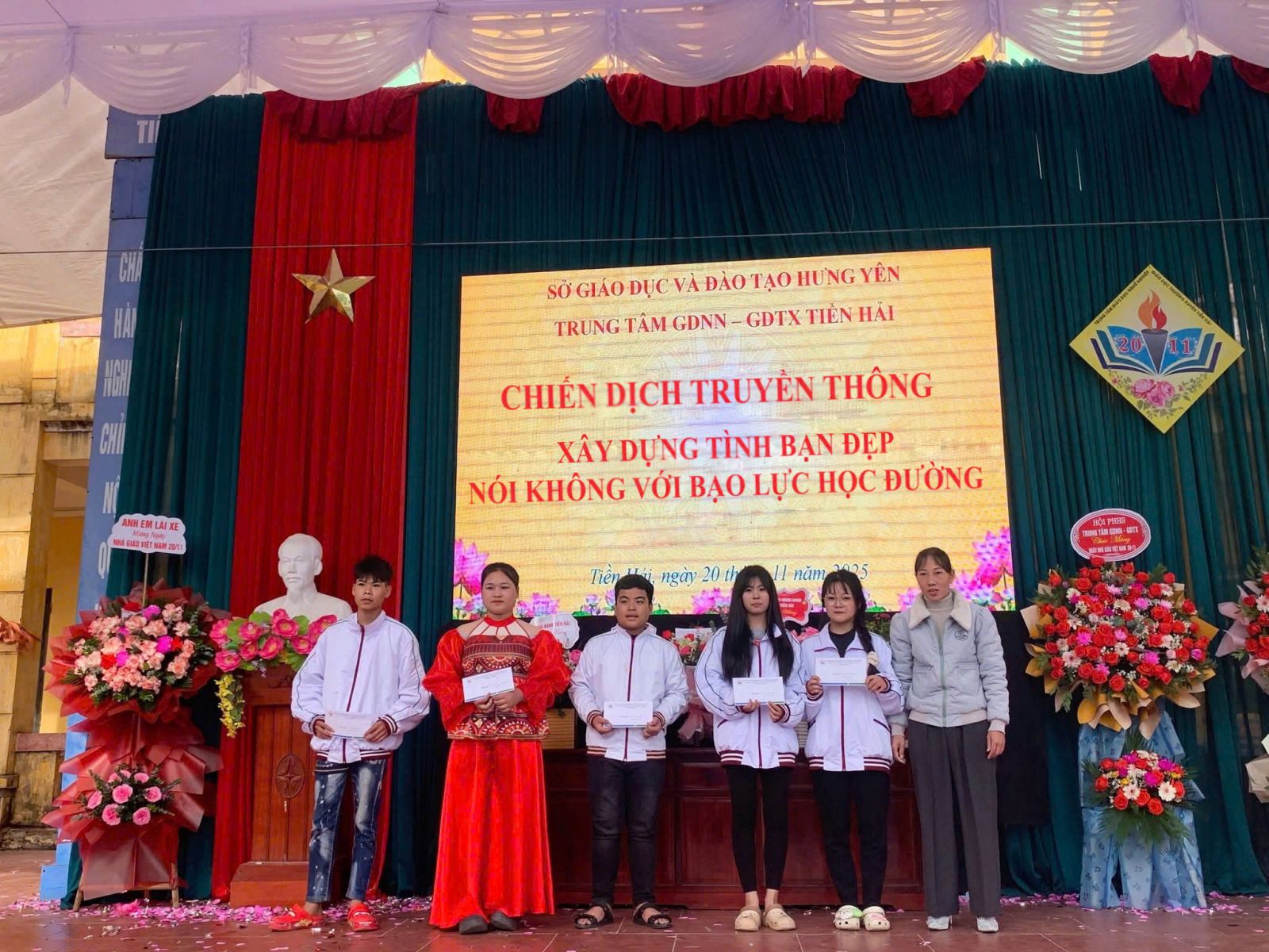 Ngày 20/11/2025, Đoàn Trung tâm GDNN – GDTX Tiền Hải đã tổ chức Chiến dịch truyền thông “Xây dựng tình bạn đẹp – Nói không với bạo lực học đường”, thu hút hơn 326 học sinh tham gia. Chiến dịch hướng tới mục tiêu xây dựng môi trường học đường an toàn, thân thiện và nâng cao nhận thức của học sinh về việc ứng xử văn minh trong trường học.