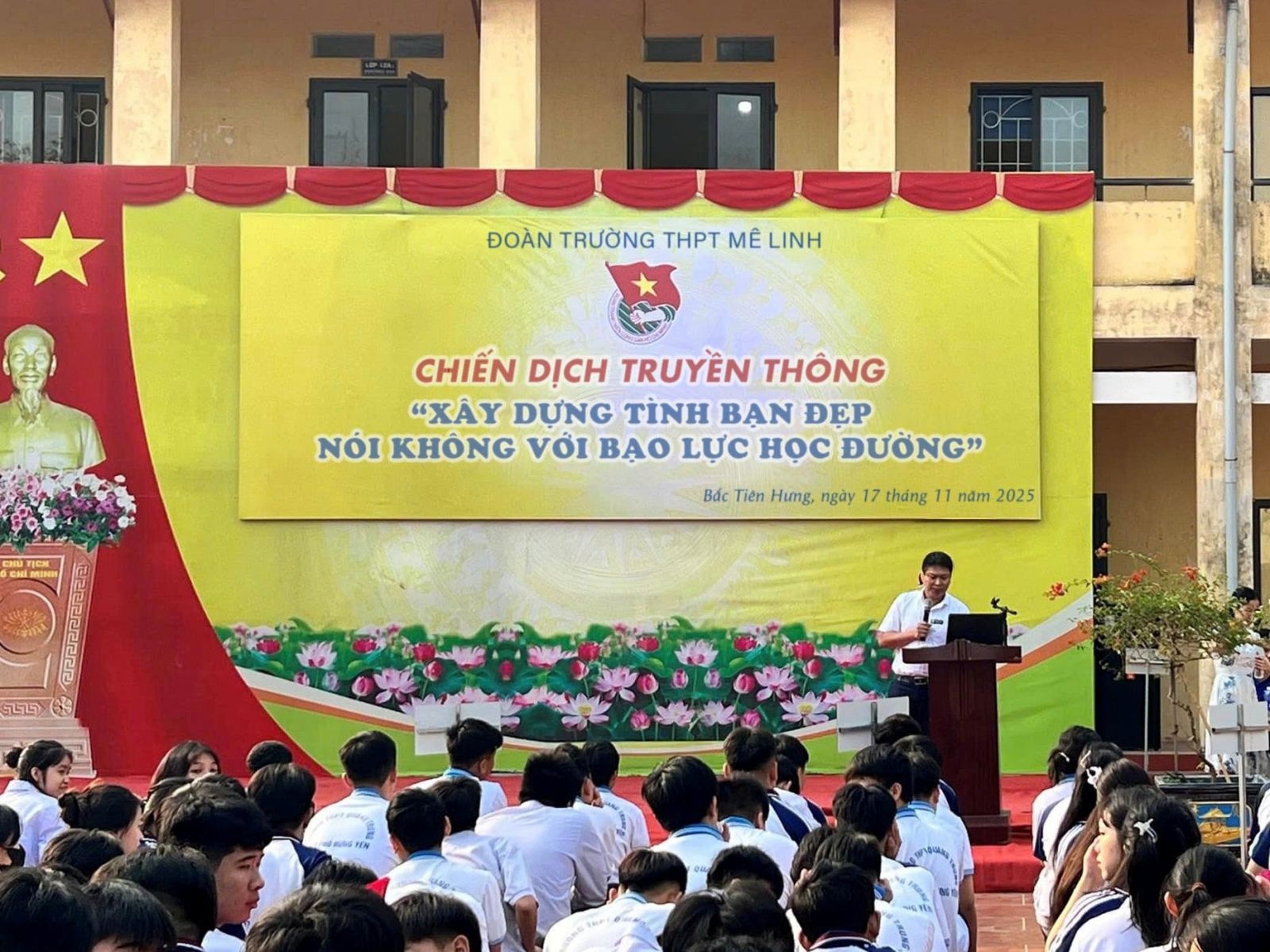 Nhằm tuyên truyền, giáo dục ý thức đạo đức, lối sống văn hóa, ngăn ngừa bạo lực học đường, định hướng xây dựng tình bạn đẹp cho học sinh; cung cấp kiến thức và sự hiểu biết về các vấn đề liên quan đến bạo lực học đường, xây dựng tình bạn đẹp, từ đó trang bị cho học sinh những kĩ năng phòng ngừa và ngăn chặn bạo lực học đường, biết bảo vệ mình và bảo vệ bạn bè xung quanh; Đoàn trường THPT Mê Linh tổ chức Chiến dịch truyền thông “Xây dựng tình bạn đẹp – Nói không với Bạo lực học đường" vào buổi sáng ngày 17/11/2025.