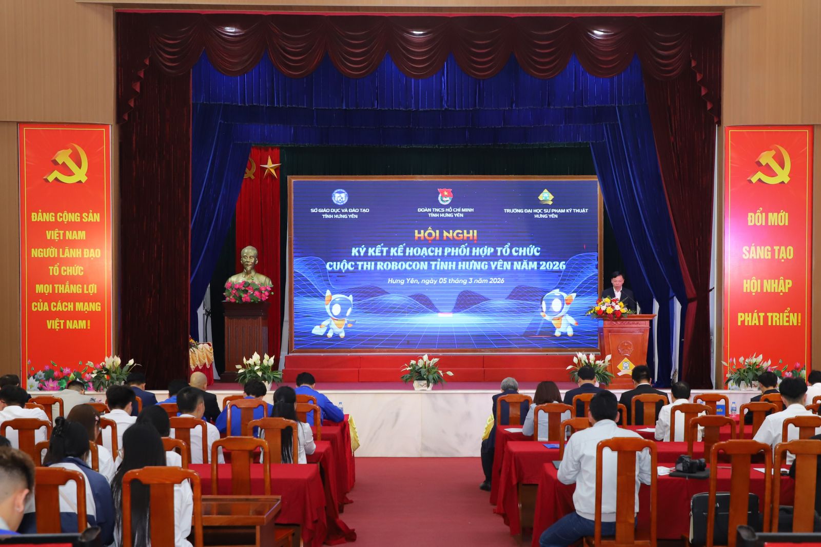 Chiều 05/3, Đoàn TNCS Hồ Chí Minh tỉnh Hưng Yên phối hợp với Sở Giáo dục và Đào tạo, Trung tâm Công nghệ - Chuyển đổi số, Học viện Chính trị quốc gia Hồ Chí Minh và Trường Đại học Sư phạm Kỹ thuật Hưng Yên tổ chức Hội nghị ký kết kế hoạch phối hợp tổ chức Cuộc thi Robocon tỉnh Hưng Yên năm 2026 và triển khai phong trào “Bình dân học vụ số” trên địa bàn tỉnh.