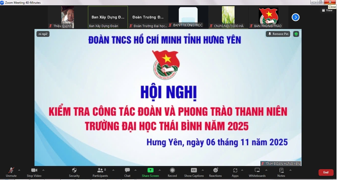 Sáng ngày 06/11/2025, BTV Tỉnh đoàn kiểm tra công tác Đoàn và phong trào thanh niên trường Đại học Thái Bình 6 tháng đầu năm học 2025-2026 bằng hình thức trực tuyến