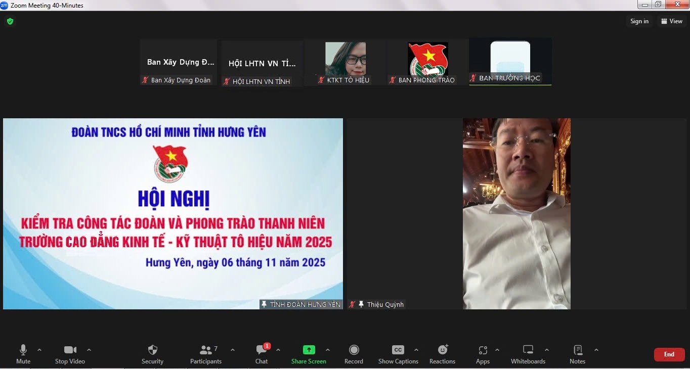 Chiều ngày 06/11/2025, BTV Tỉnh đoàn kiểm tra công tác Đoàn và phong trào thanh niên trường Cao đẳng Kinh tế kỹ thuật Tô Hiệu 6 tháng đầu năm học 2025-2026 bằng hình thức trực tuyến