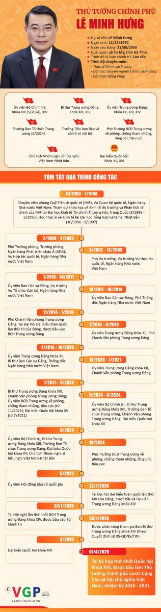 Chiều 7/4, với 495/495 đại biểu tham gia biểu quyết tán thành, Quốc hội đã thông qua Nghị quyết bầu đồng chí Lê Minh Hưng, Ủy viên Bộ Chính trị, Bí thư Trung ương Đảng, Trưởng Ban Tổ chức Trung ương giữ chức Thủ tướng Chính phủ nước Cộng hòa xã hội chủ nghĩa Việt Nam nhiệm kỳ 2026-2031.