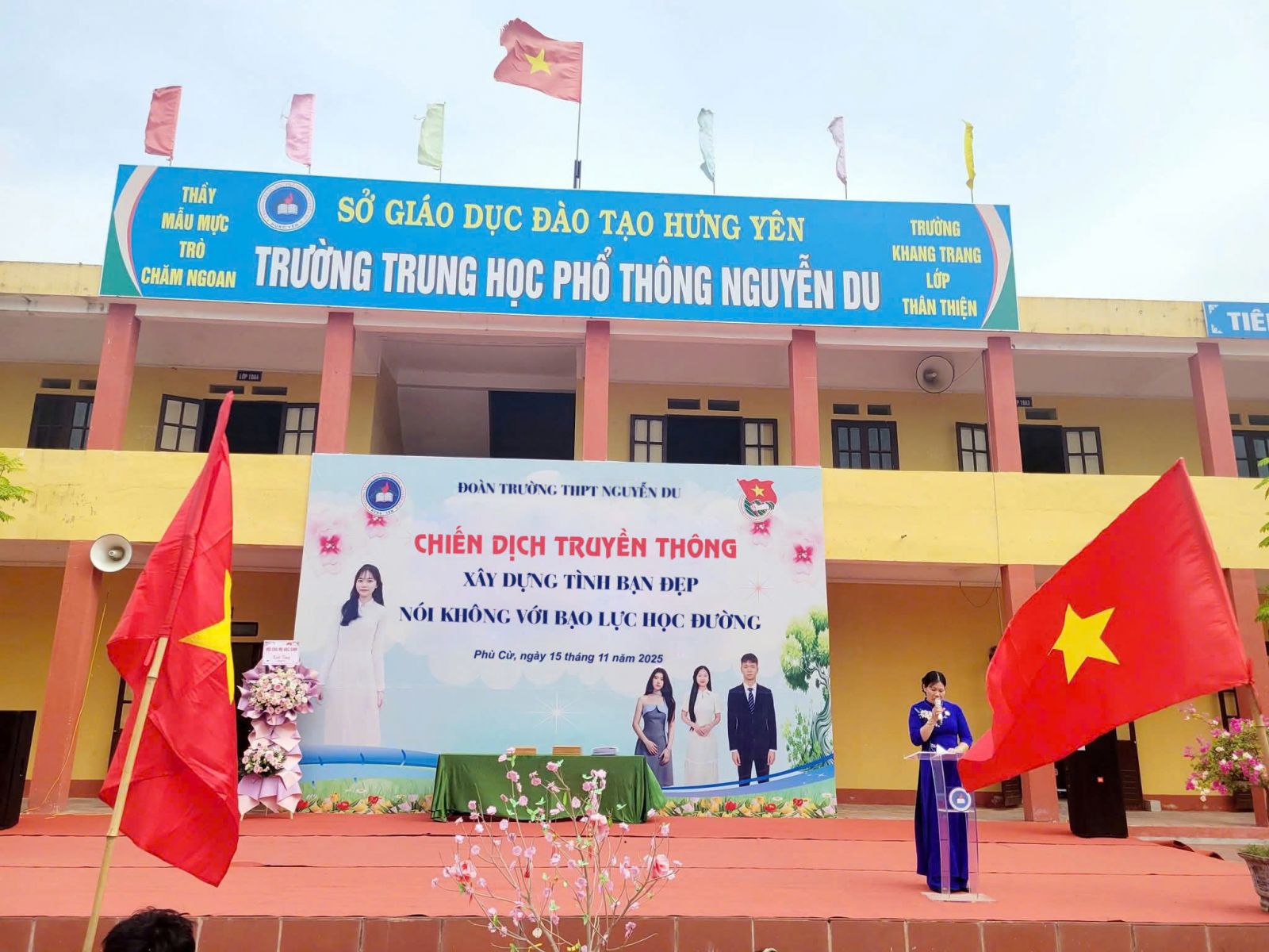 Chiều ngày 15/11/2025, tại sân trường THPT Nguyễn Du đã diễn ra Chiến dịch truyền thông “Xây dựng tình bạn đẹp - Nói không với bạo lực học đường” , tạo nên một chương trình vô cùng ý nghĩa đối với thầy cô giáo và các em học sinh trong nhà trường.