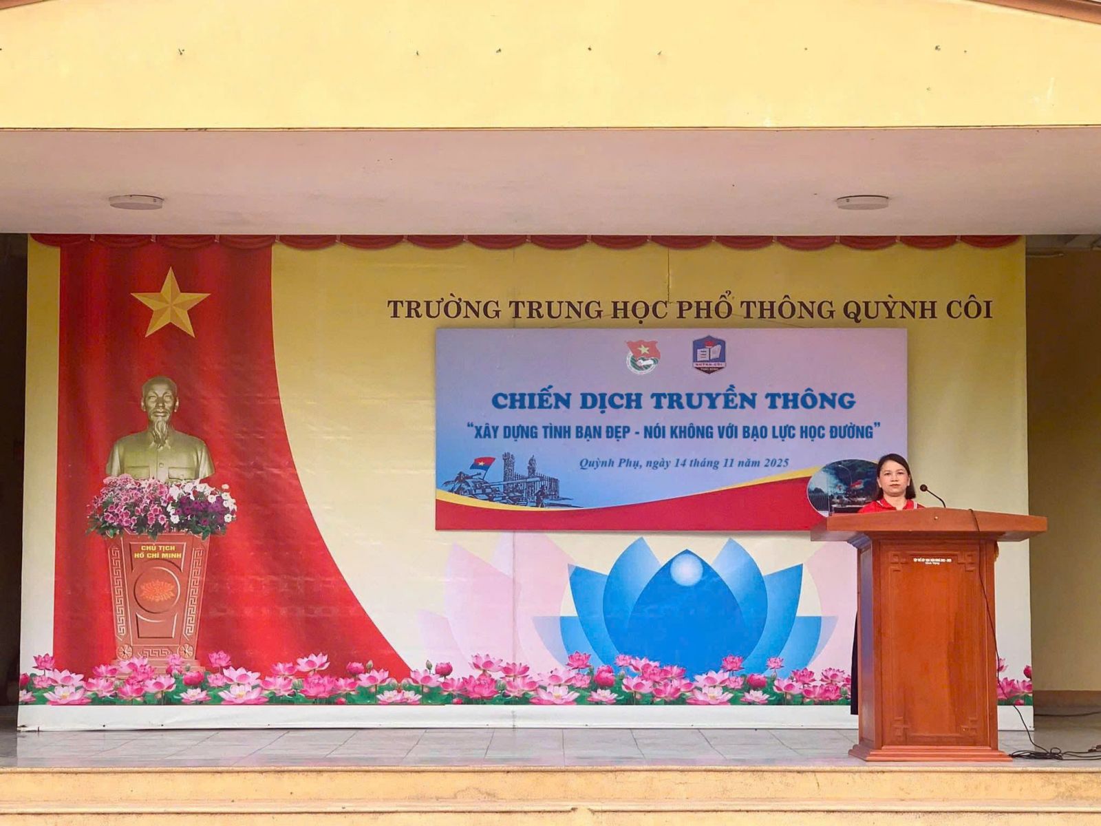 Ngày 14/11/2025, Đoàn trường THPT Quỳnh Côi đã tổ chức Chiến dịch truyền thông “Xây dựng tình bạn đẹp – Nói không với bạo lực học đường”, thu hút hơn 1000 học sinh tham gia. Chiến dịch hướng tới mục tiêu xây dựng môi trường học đường an toàn, thân thiện và nâng cao nhận thức của học sinh về việc ứng xử văn minh trong trường học.