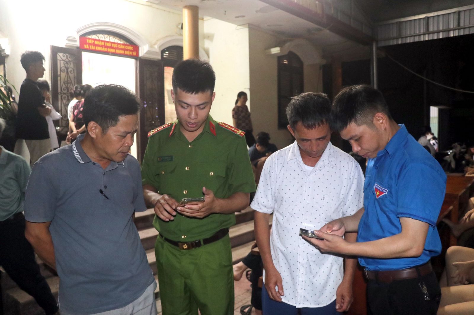 Lực lượng đoàn viên, thanh niên và công an xã Hưng Hà hỗ trợ người dân tích hợp tài khoản an sinh xã hội trên ứng dụng VNeID, đồng thời cài đặt và sử dụng ứng dụng báo cháy 114