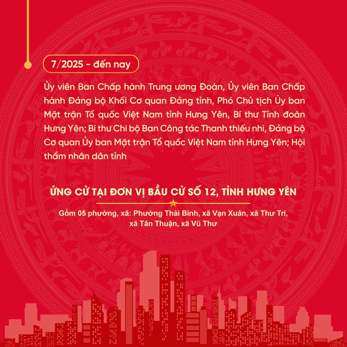 Đồng chí Thiệu Minh Quỳnh - Ủy viên BCH Trung ương Đoàn, Phó Chủ tịch Ủy ban MTTQ Việt Nam tỉnh, Bí thư Tỉnh đoàn ứng cử đại biểu Hội đồng Nhân dân tỉnh khóa XVIII, nhiệm kỳ 2026 - 2031 tại đơn vị bầu cử số 12, gồm 05 phường, xã: Phường Thái Bình, xã Vạn Xuân, xã Thư Trì, xã Tân Thuận, xã Vũ Thư.