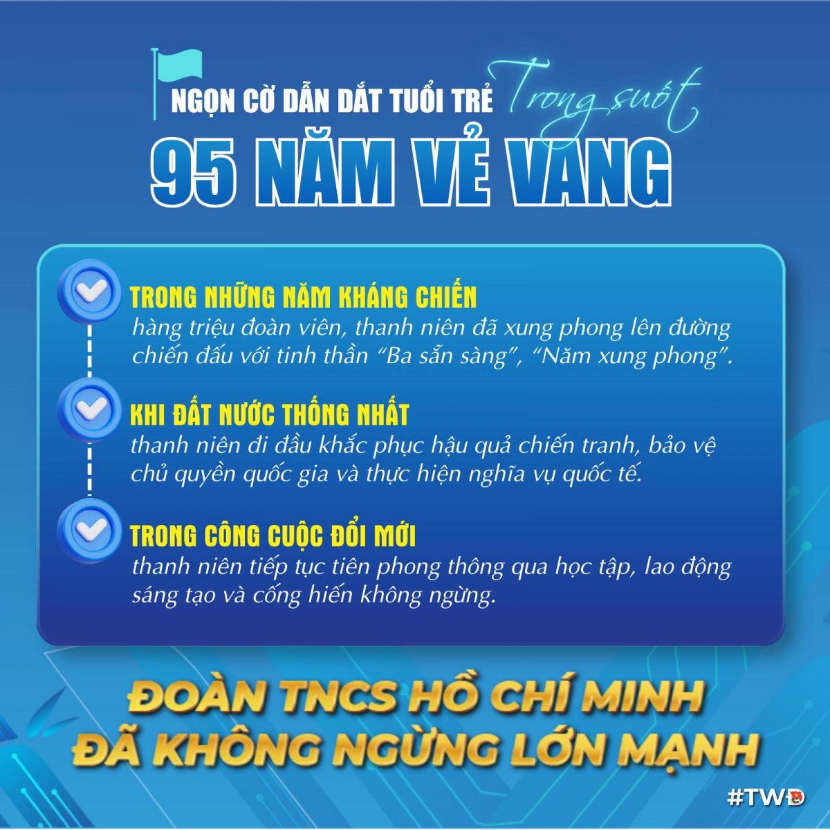 Chặng đường 95 năm là niềm tự hào, đồng thời cũng là điểm khởi đầu cho những hành trình mới với yêu cầu cao hơn. Truyền thống vẻ vang của các thế hệ đi trước chính là nền tảng, là động lực để tuổi trẻ hôm nay tiếp tục vững bước trong kỷ nguyên mới.