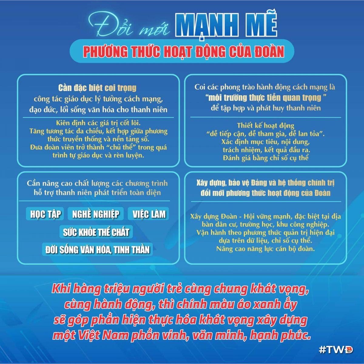 Khi hàng triệu người trẻ cùng chung khát vọng, cùng hành động, thì chính màu áo xanh ấy sẽ góp phần hiện thực hóa khát vọng xây dựng một VN phồn vinh, văn minh, hạnh phúc.