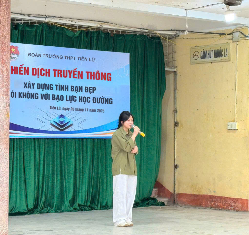 Nhằm tuyên truyền, giáo dục ý thức đạo đức, lối sống văn hóa, ngăn ngừa bạo lực học đường, định hướng xây dựng tình bạn đẹp cho học sinh; cung cấp kiến thức và sự hiểu biết về các vấn đề liên quan đến bạo lực học đường; từ đó trang bị cho học sinh những kĩ năng phòng ngừa và ngăn chặn bạo lực học đường, biết bảo vệ mình và bảo vệ bạn bè xung quanh; tạo môi trường học tập lành mạnh, thân thiện làm động lực cho học sinh đến trường mỗi ngày; Ngày 26/11/2025, Đoàn trường THPT Tiên Lữ tổ chức Chiến dịch truyền thông “Xây dựng tình bạn đẹp – Nói không với Bạo lực học đường”.