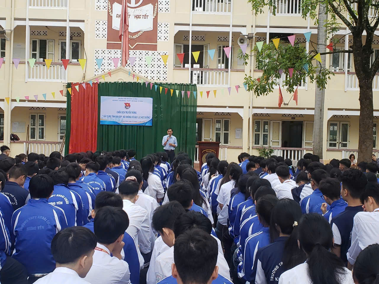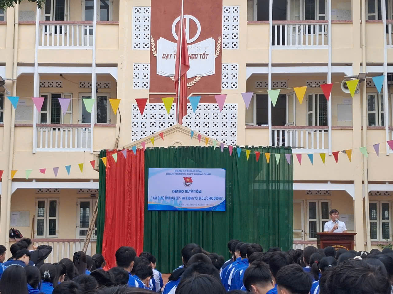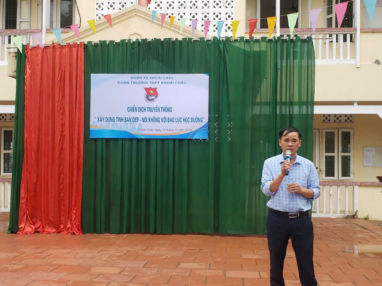 Nhằm Cung cấp kiến thức và sự hiểu biết về các vấn đề liên quan đến bạo lực học đường, xây dựng tình bạn đẹp, từ đó trang bị cho học sinh những kĩ năng phòng ngừa và ngăn chặn bạo lực học đường, biết bảo vệ mình và bảo vệ bạn bè xung quanh. Tạo môi trường học tập lành mạnh, thân thiện làm động lực cho học sinh đến trường mỗi ngày. Hôm nay, ngày 10/11/2025, Đoàn Trường THPT Khoái Châu đã tổ chức Chiến dịch truyền thông Xây dựng tình bạn đẹp – Nói không với Bạo lực học đường .