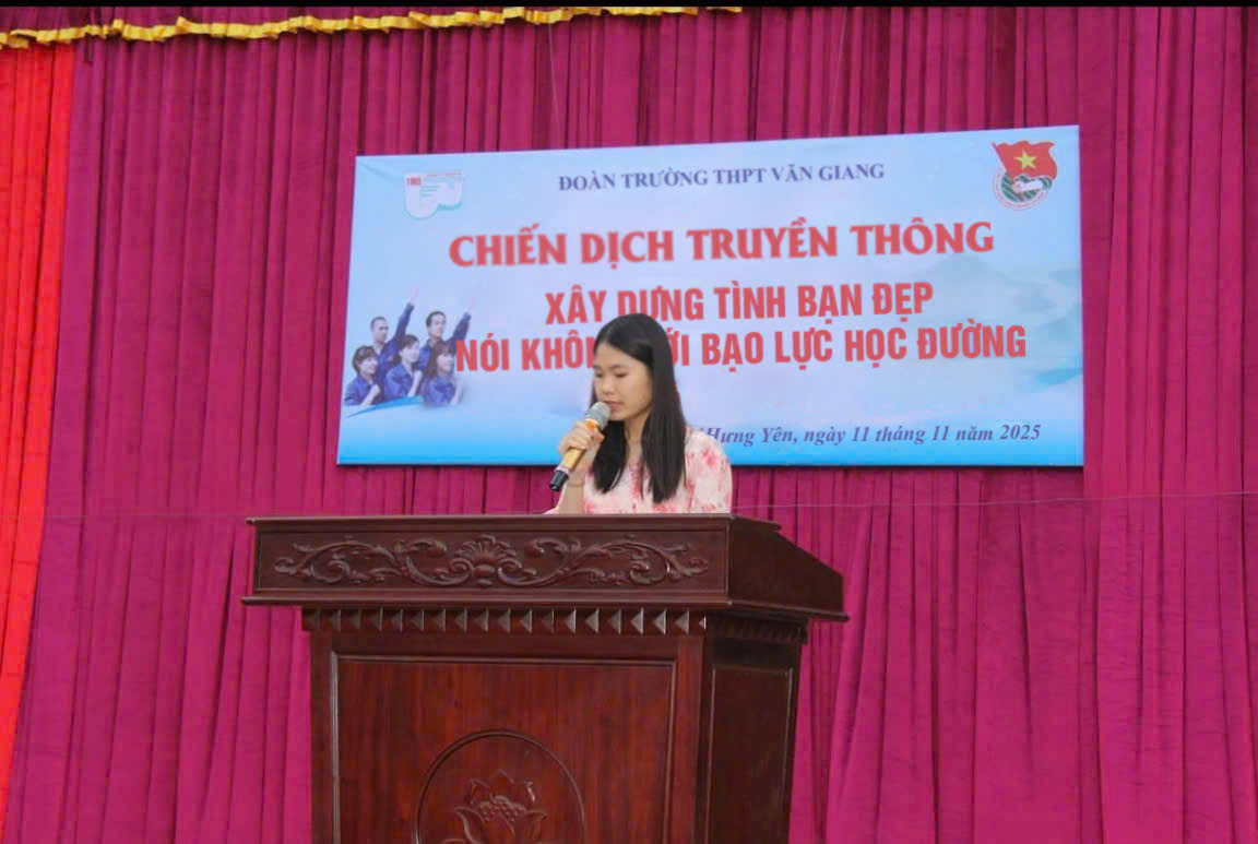 Nhằm góp phần xây dựng môi trường học đường an toàn, thân thiện và lành mạnh, sáng ngày 11/11/2025, Đoàn trường THPT Văn Giang tổ chức Chiến dịch truyền thông “Xây dựng tình bạn đẹp – Nói không với bạo lực học đường” trong tiết sinh hoạt dưới cờ.