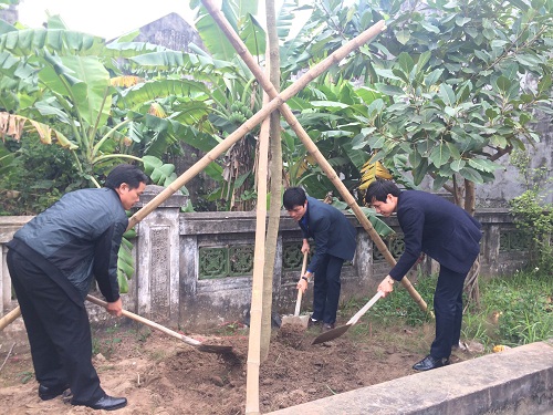 Các đại biểu và đoàn viên thanh niên trồng cây xanh tại nhà thờ Bà Hoàng Thị Loan.